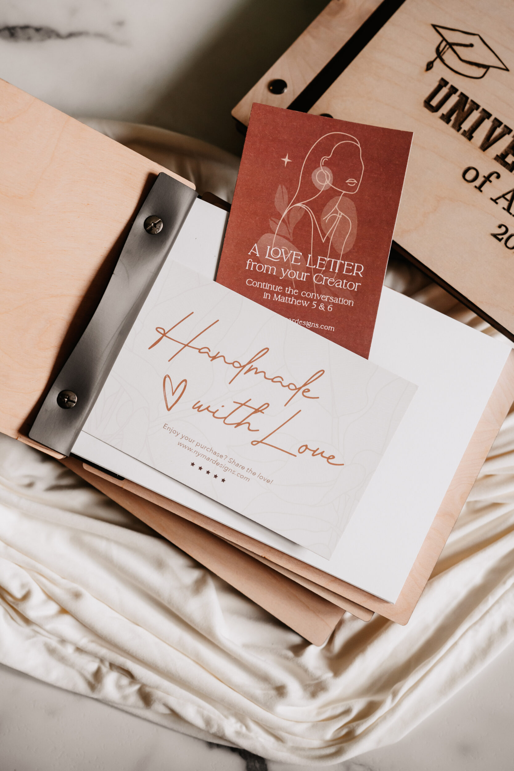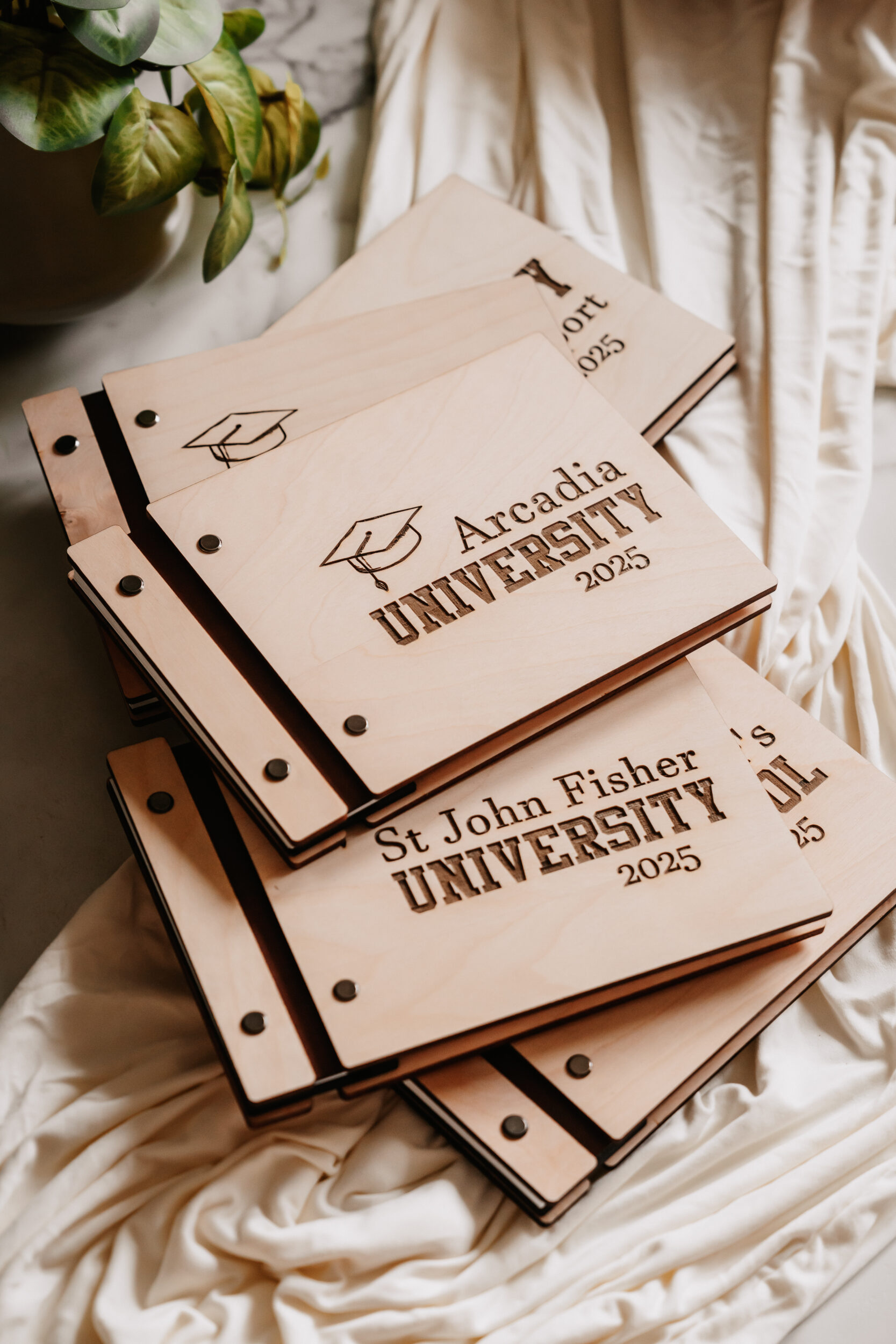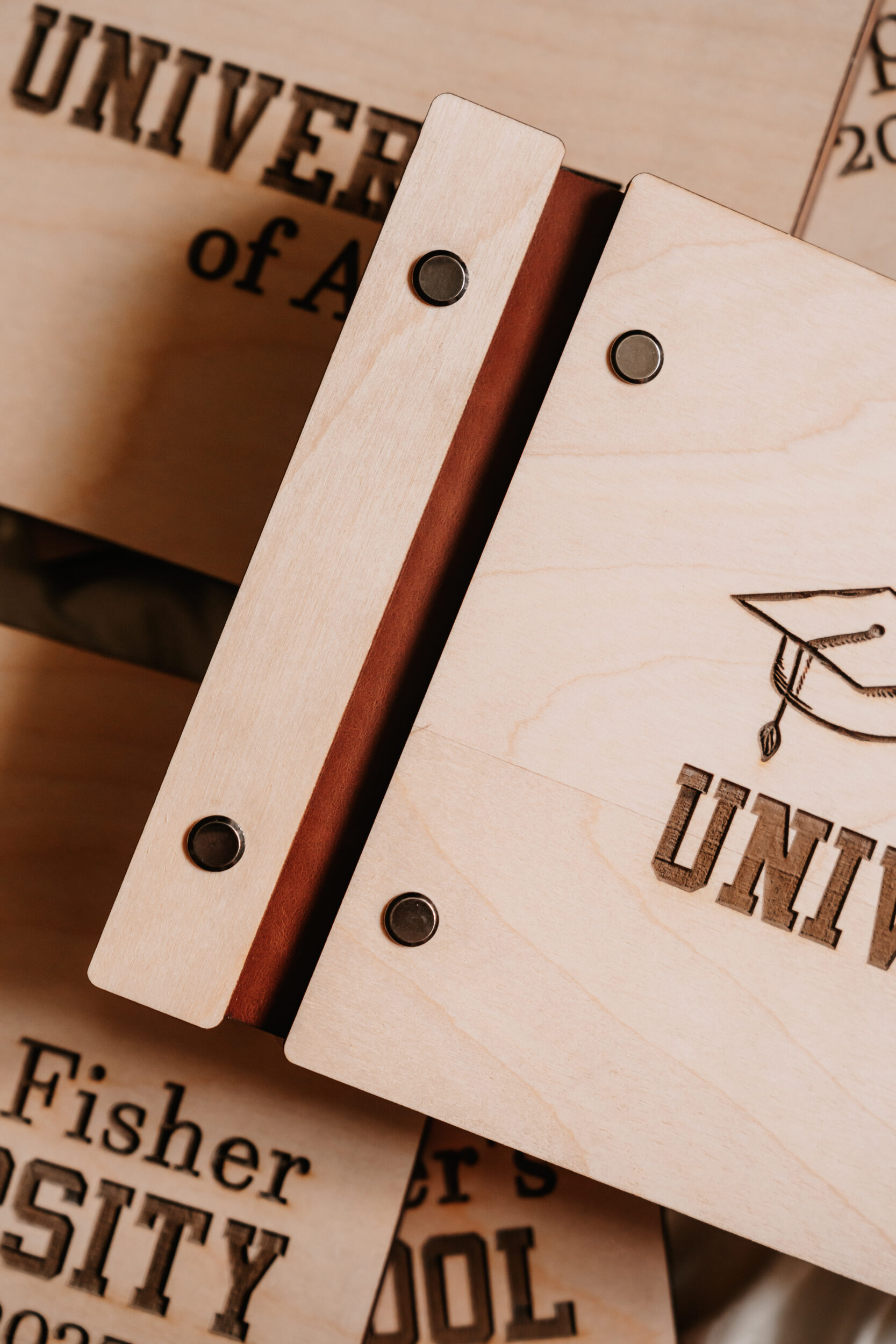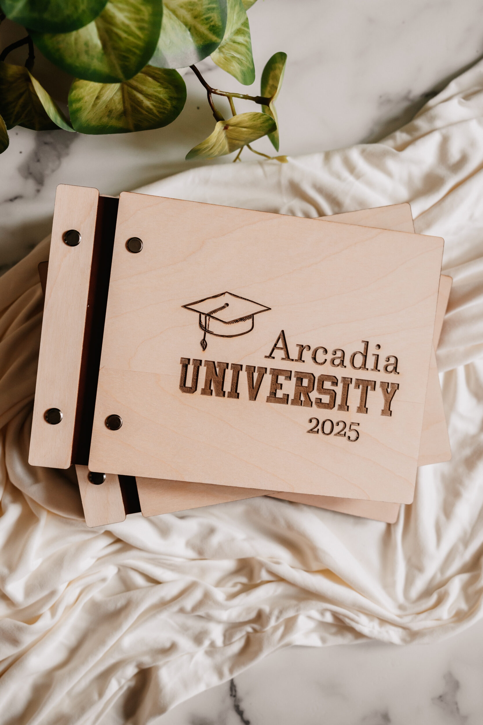 Choose your wood type, vegan leather binding, cardstock color, and personalized engraving to create a meaningful keepsake that honors your graduate’s big achievement. A timeless piece to cherish long after the cap is tossed!