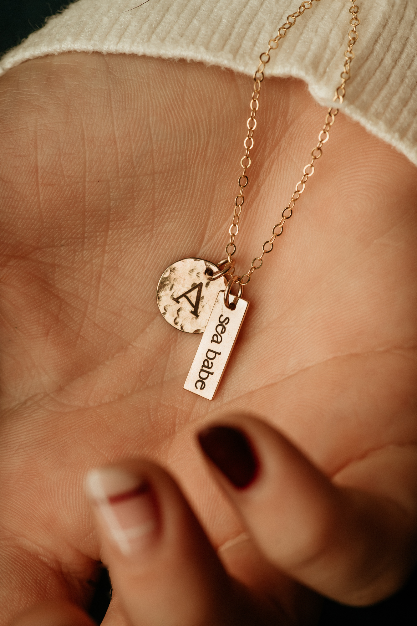 Each charm is precision laser-engraved so even tiny details remain crisp and readable. Initials are carefully positioned by eye for thoughtful placement, and may sit slightly off-center, reflecting the charm and uniqueness of this handmade piece. Lightweight and sentimental, it’s a necklace you’ll wear every day, carrying your favorite names and moments close to your heart.