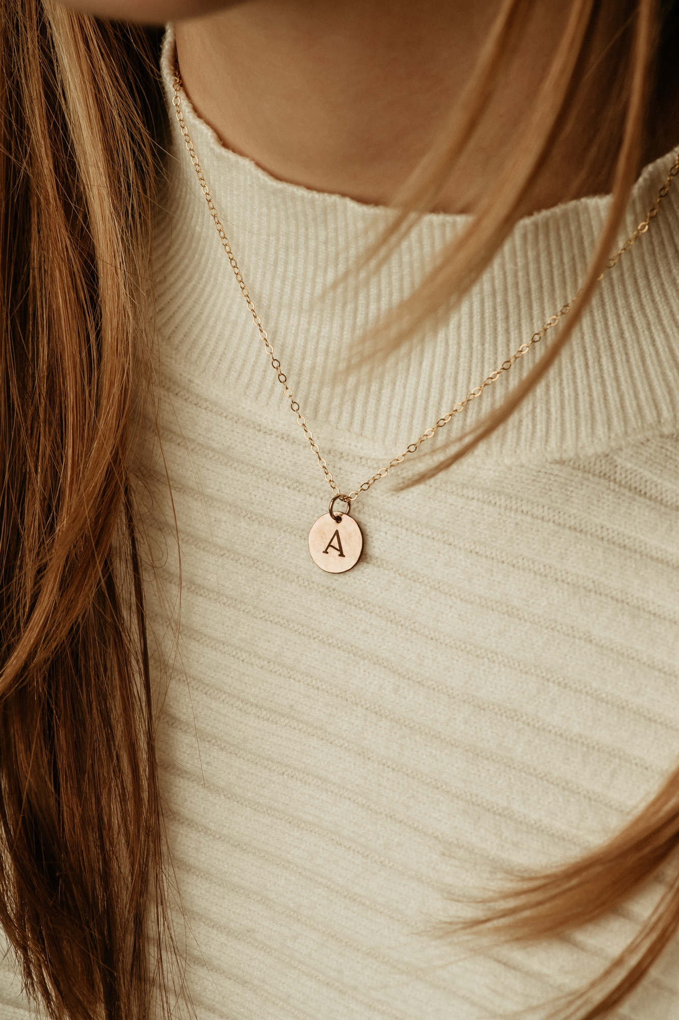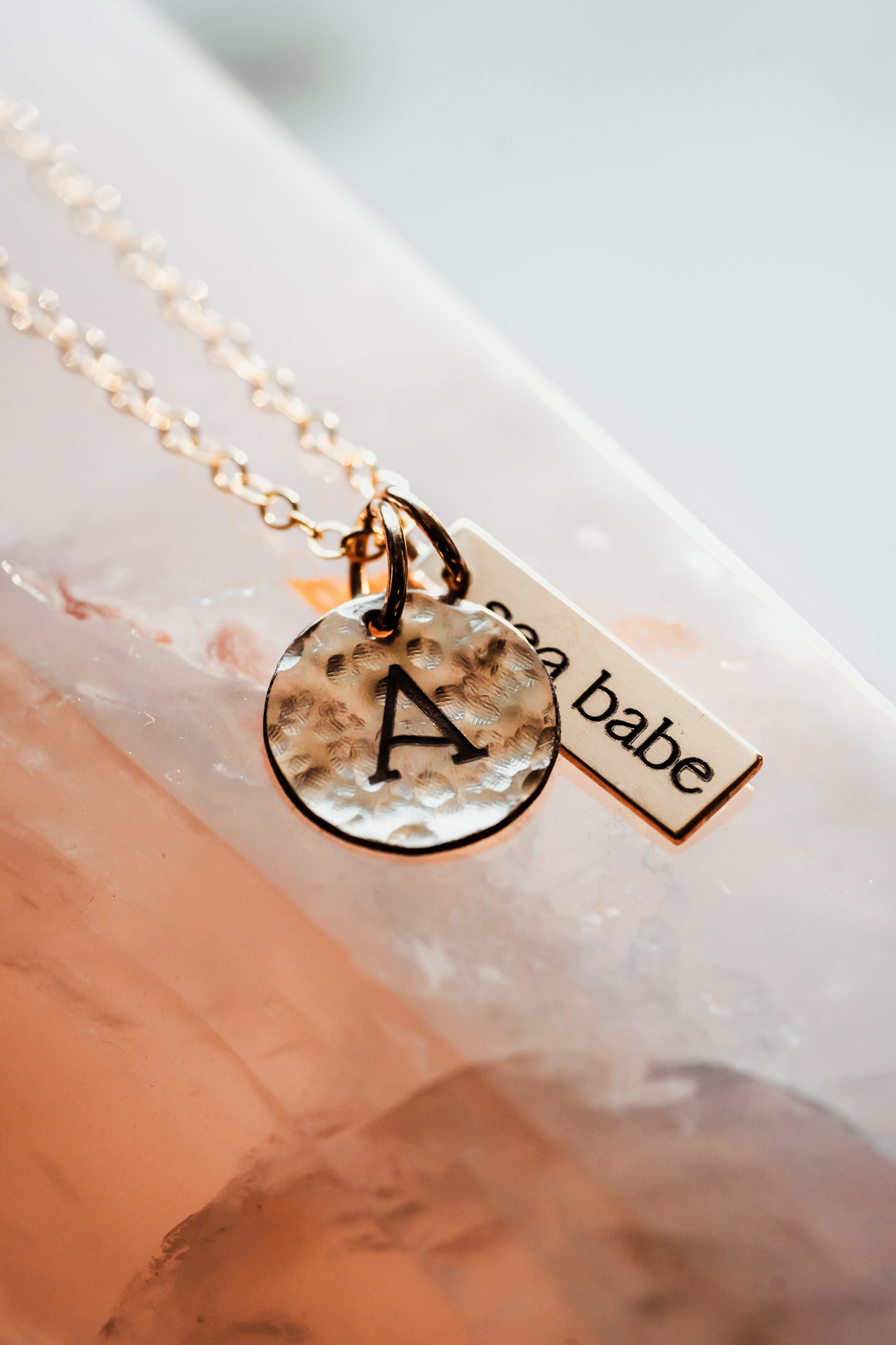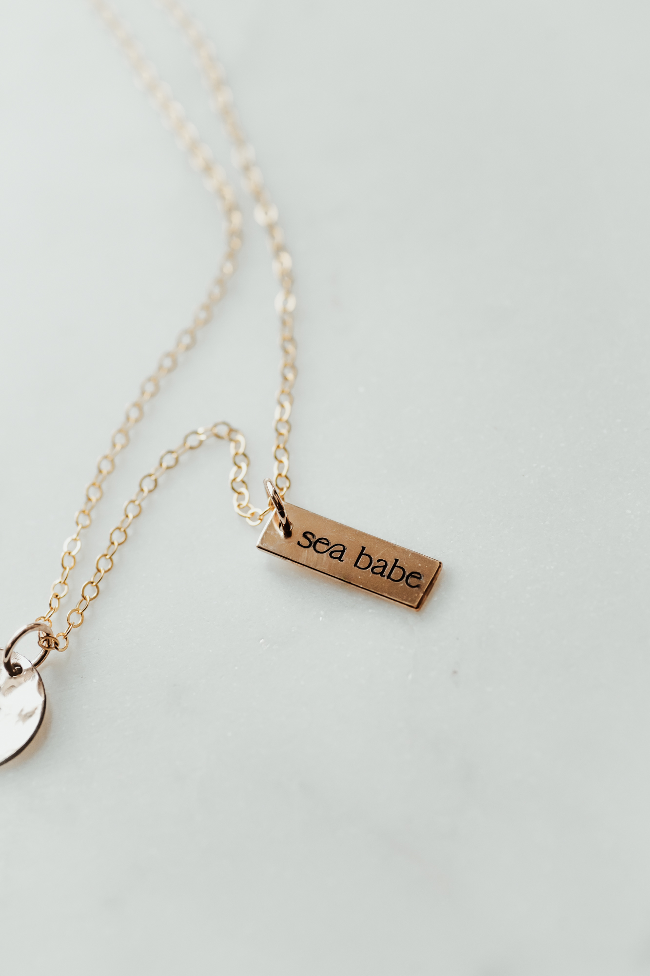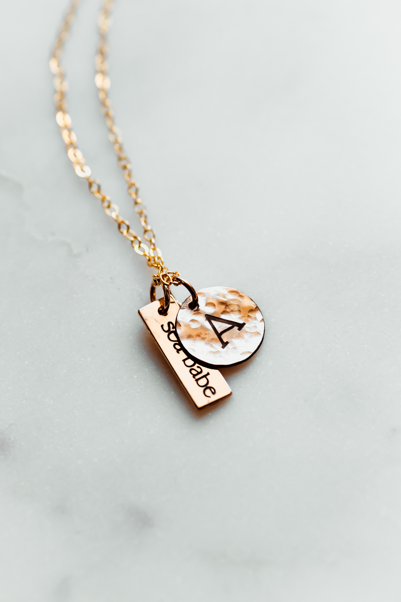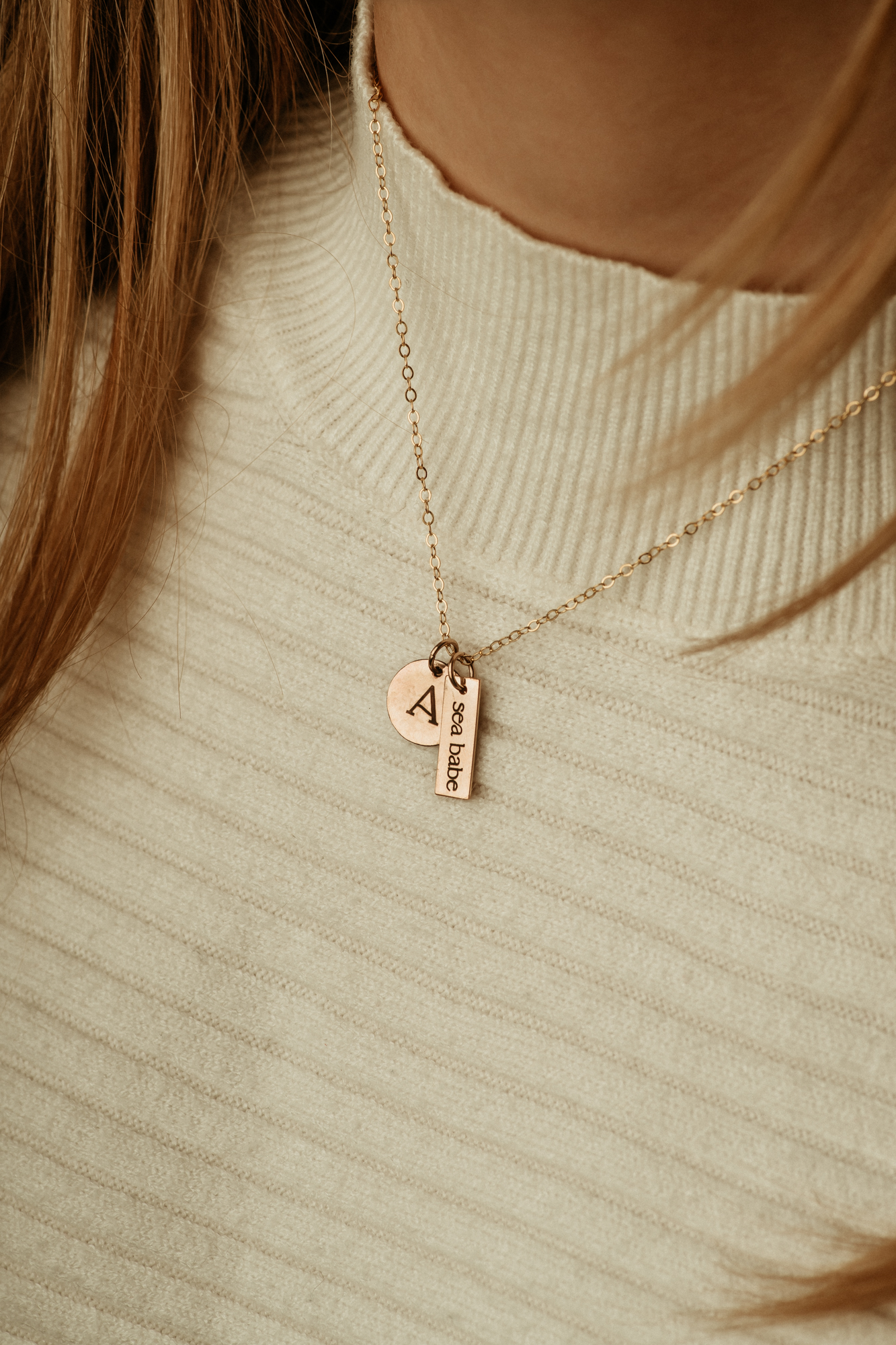 *Photos feature 1x Circle Charm and 1x Rectangle Tag on a Gold Filled Cable chain.