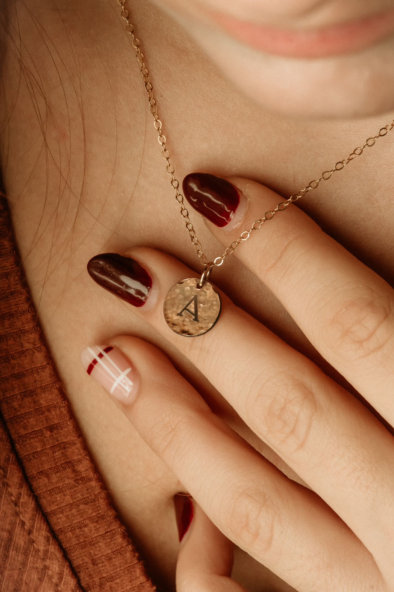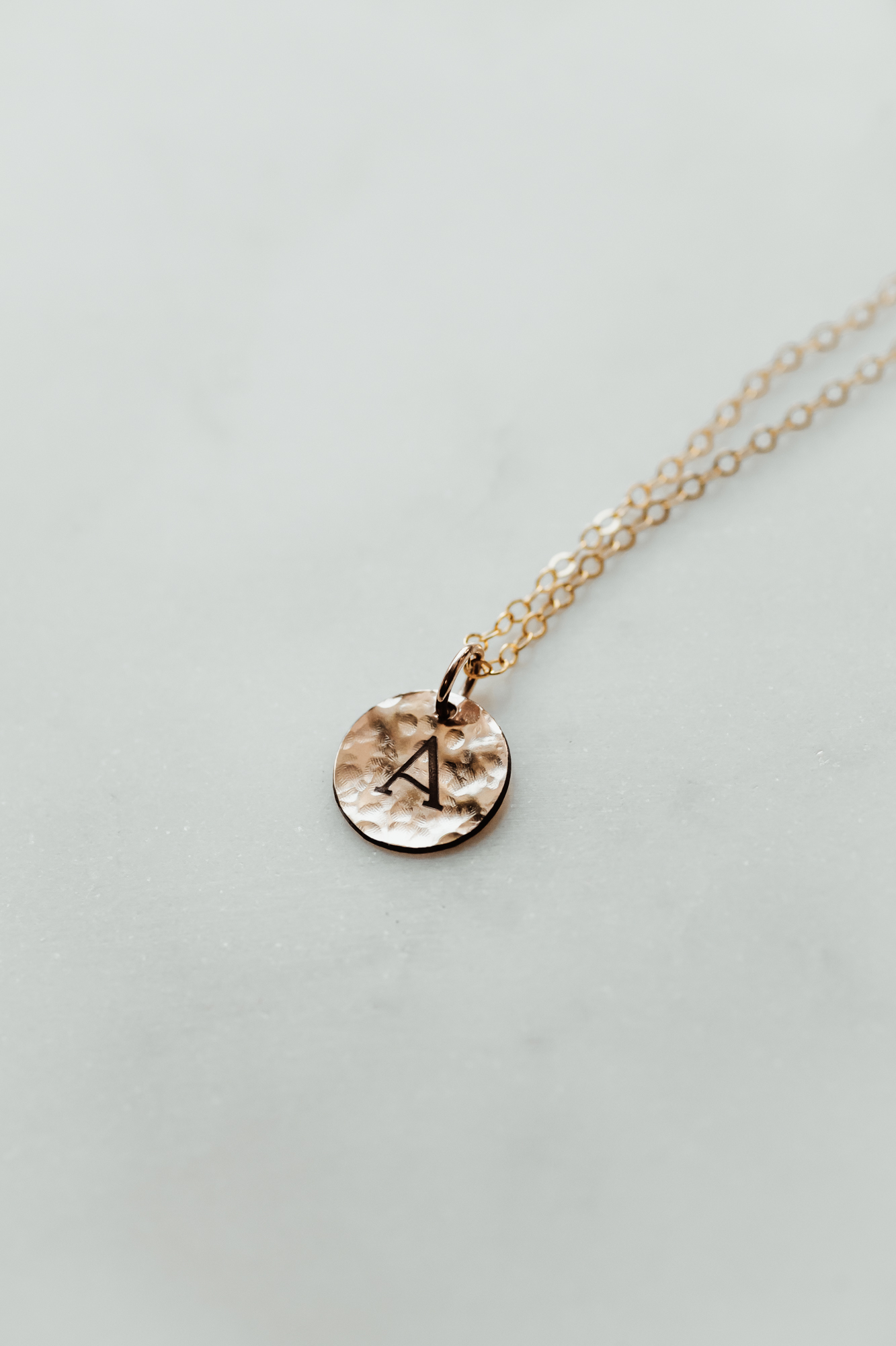 This dainty necklace features a 12mm hammered circle charm with the option to add a slim rectangle tag for a layered, personalized look. The circle charm is perfect for an initial, while the rectangle tag provides space for a name, date, or meaningful phrase. Both charms are available in your choice of gold or silver, creating a soft, everyday piece that’s easy to layer or wear on its own.