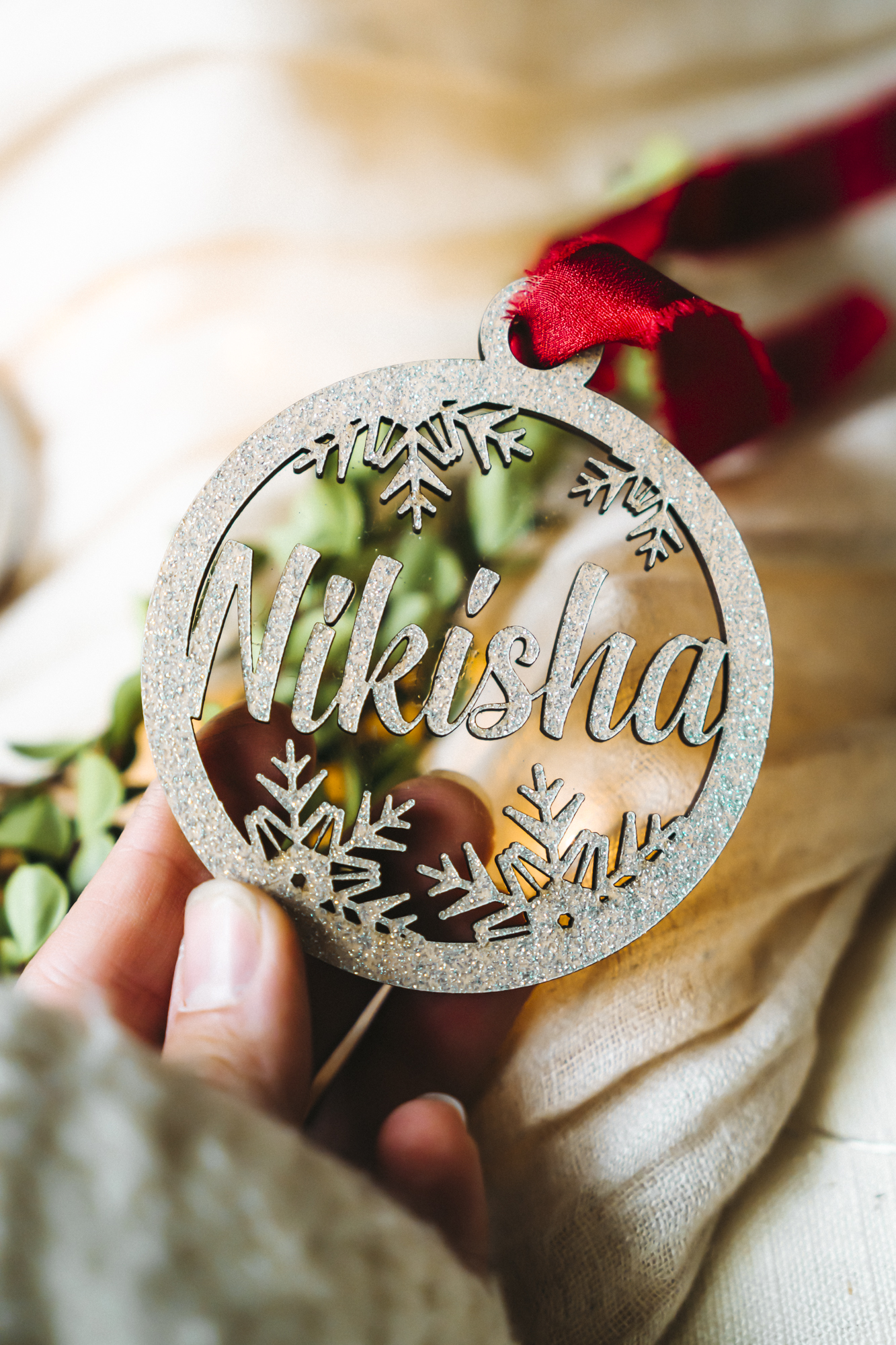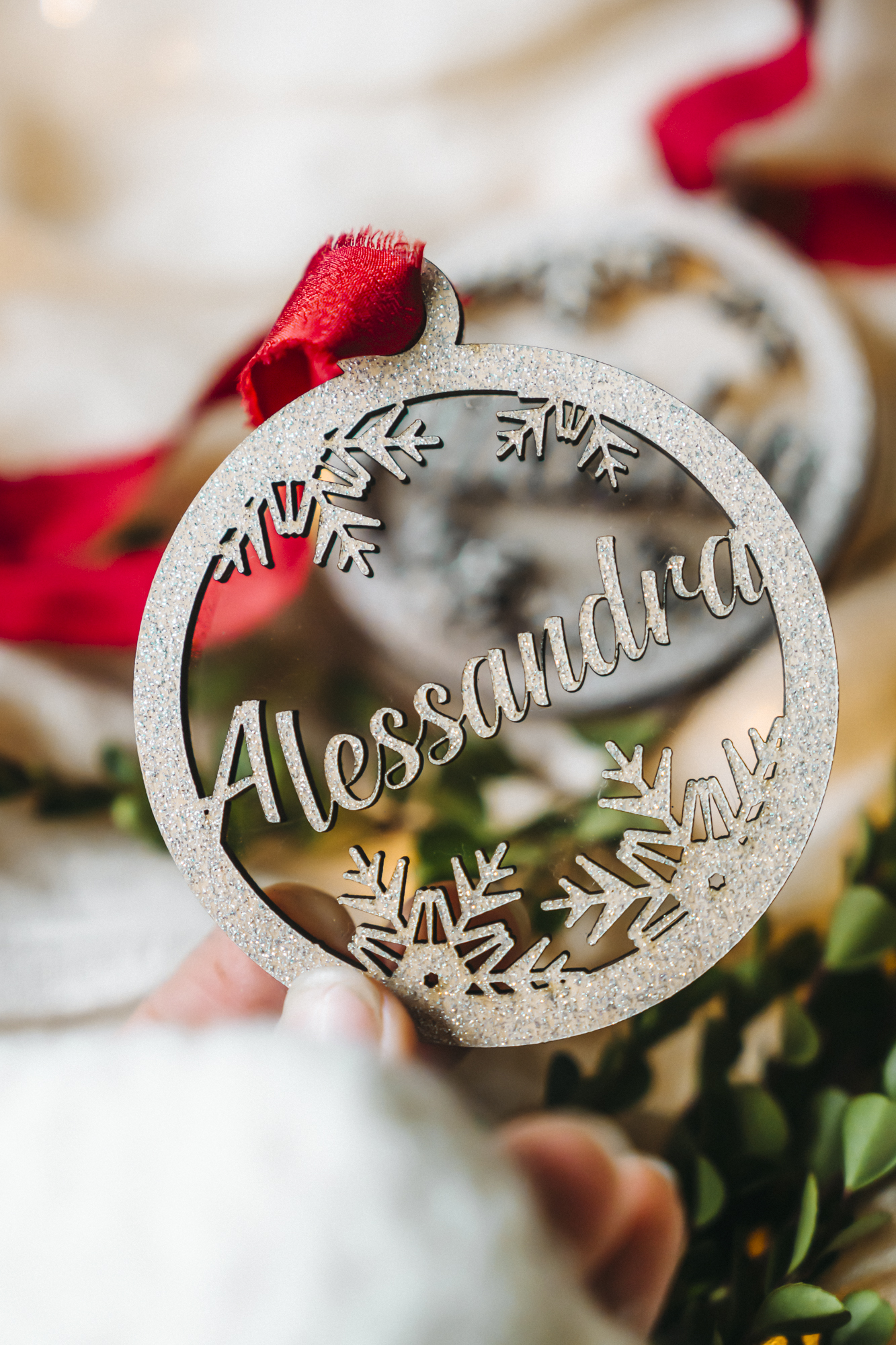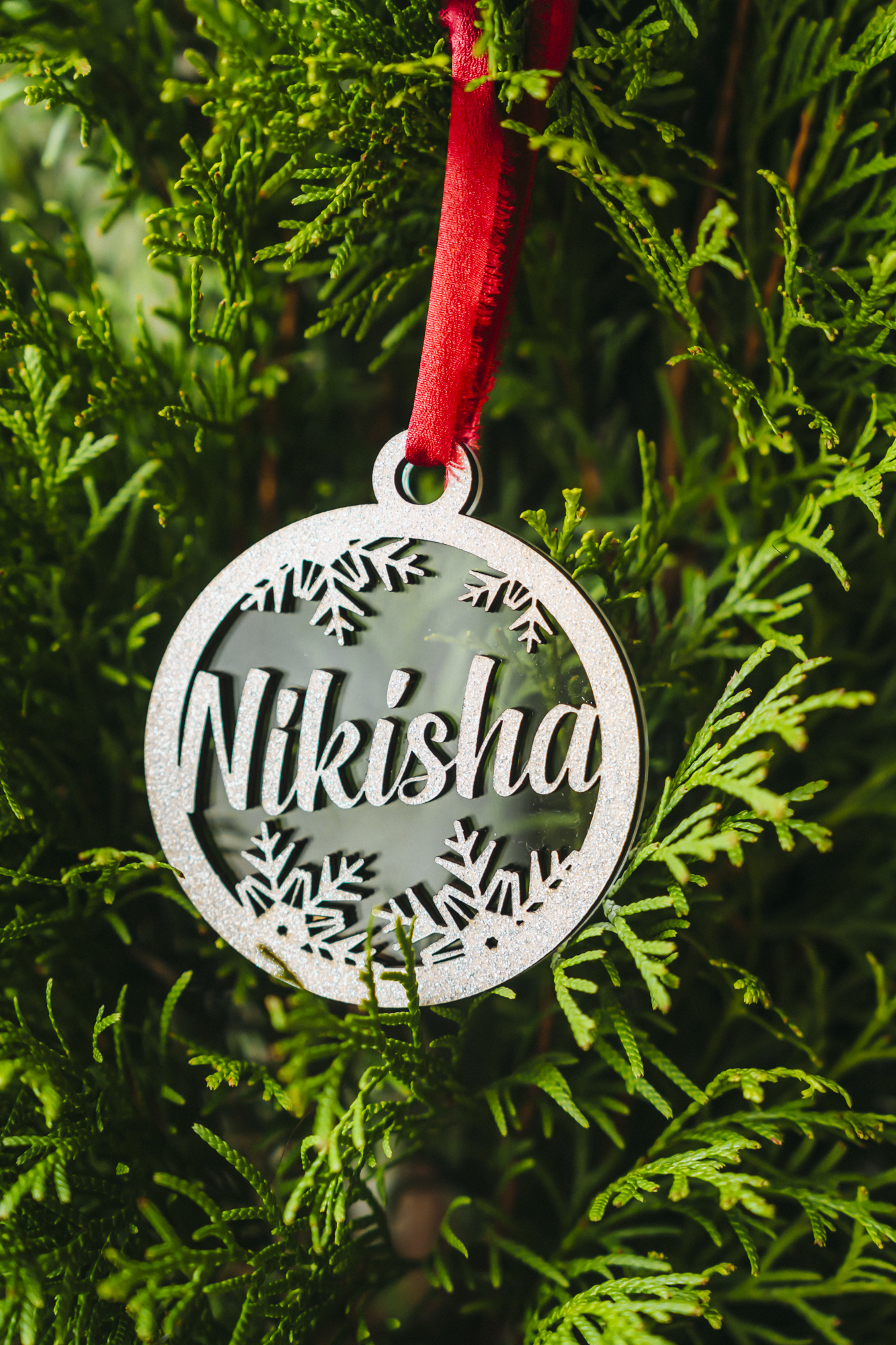 Add a touch of sparkle to your holiday tree with this personalized snowy Christmas ornament, featuring a 3D name design layered over clear acrylic with a subtle shimmer. Each ornament combines natural birch wood layered in sparkle glitter placed onto clear acrylic for a warm, frosted look that catches the light beautifully — like freshly fallen snow.