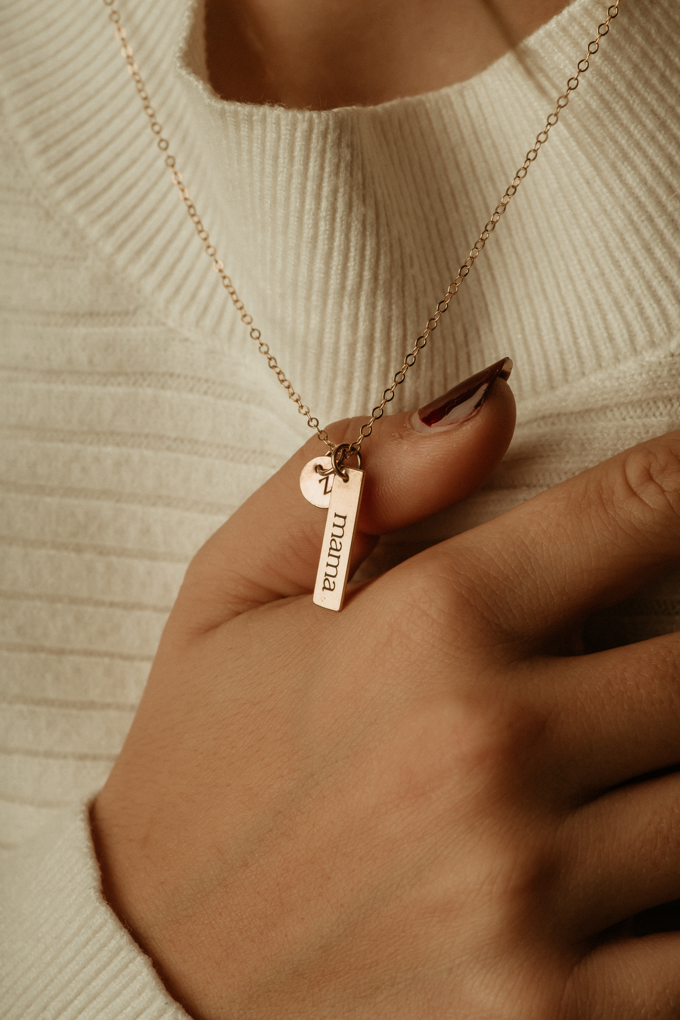 A delicate gold or silver necklace featuring a slim rectangle tag paired with a tiny circle charm, personalized with names or initials for a soft, everyday meaningful piece.