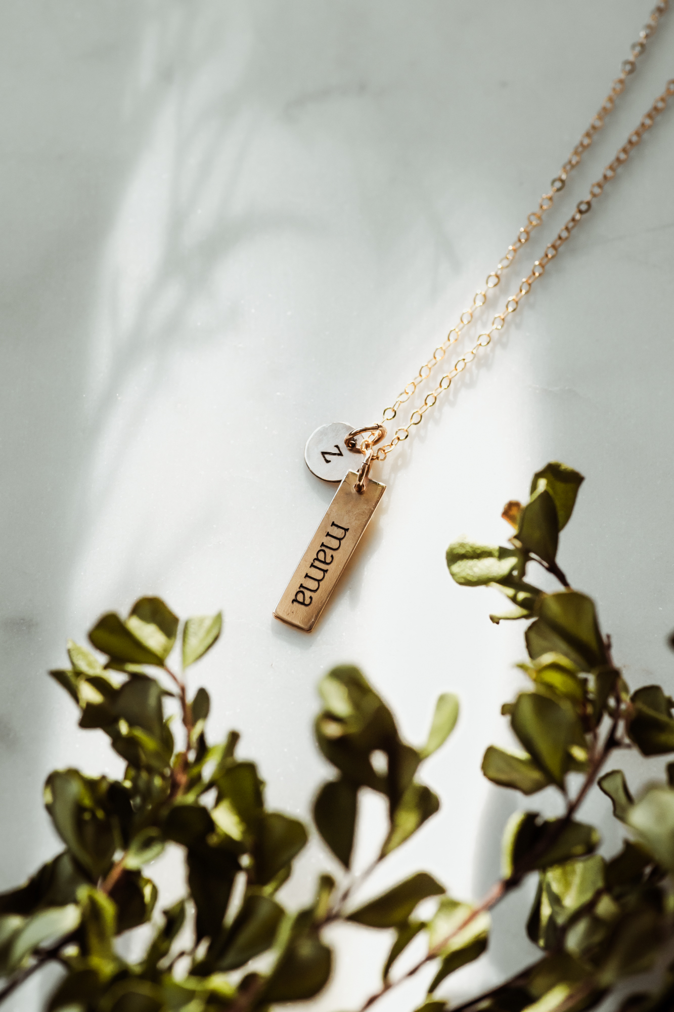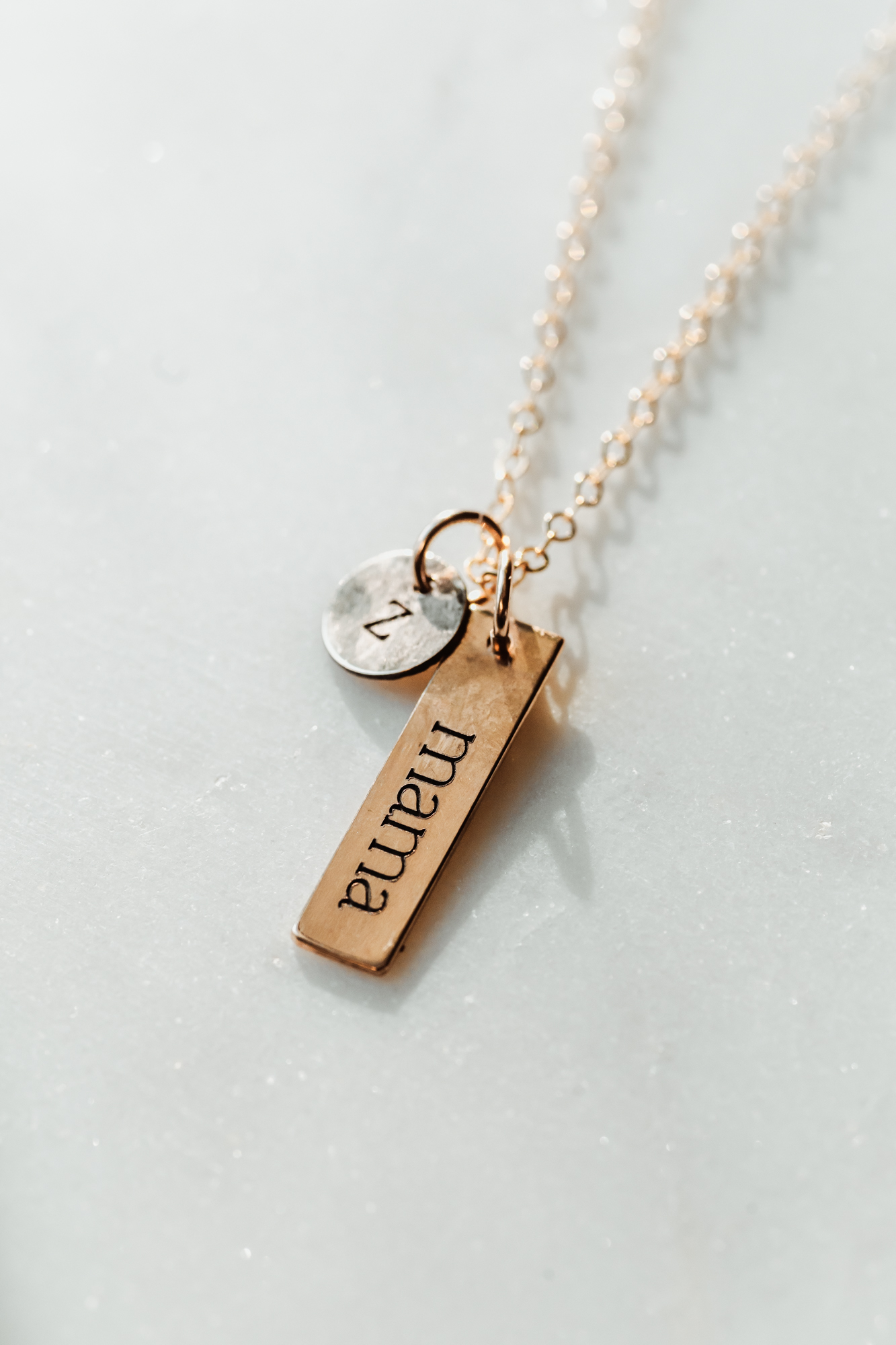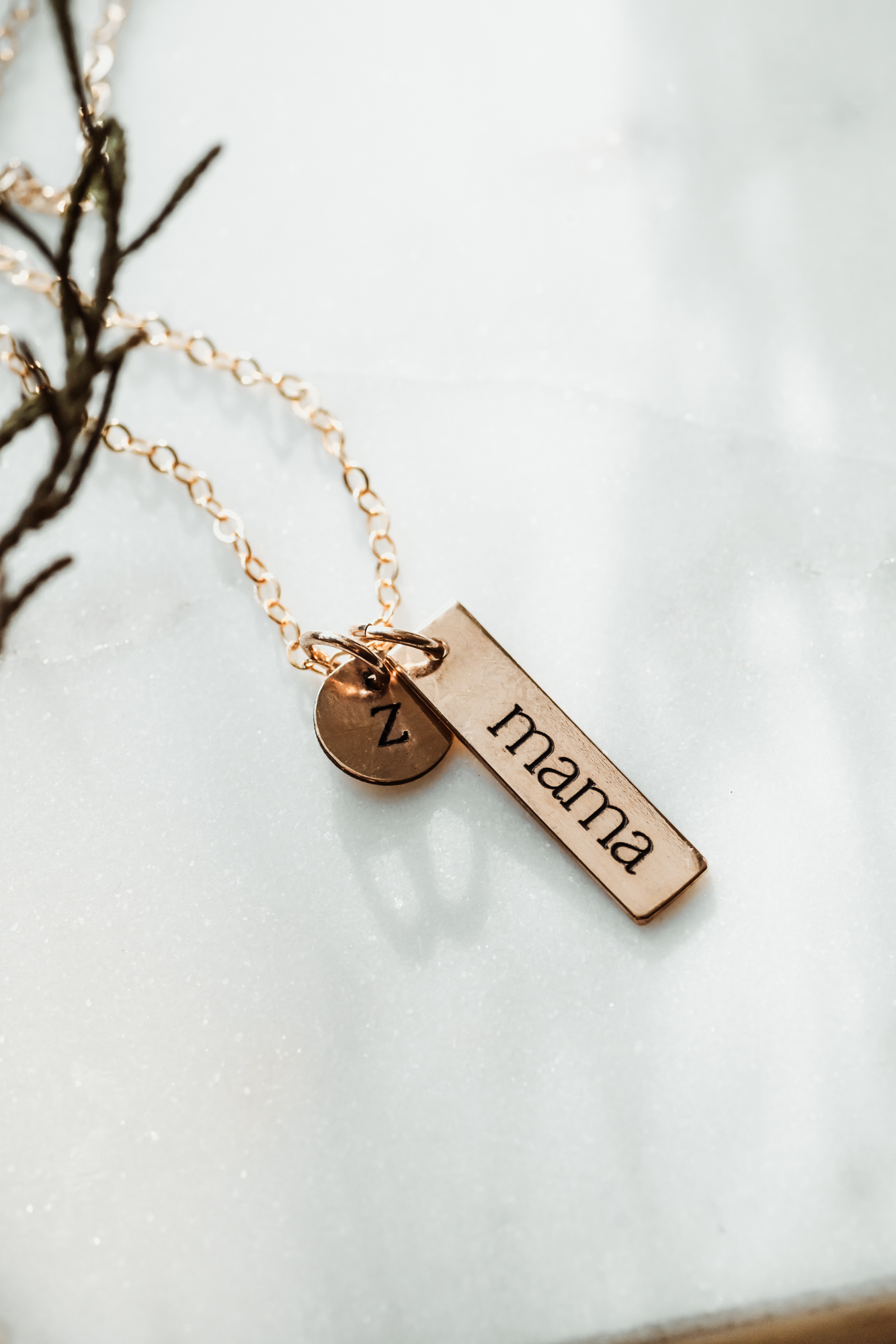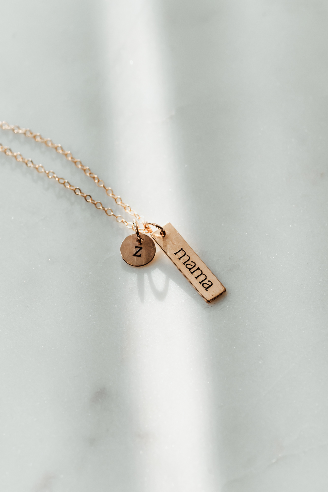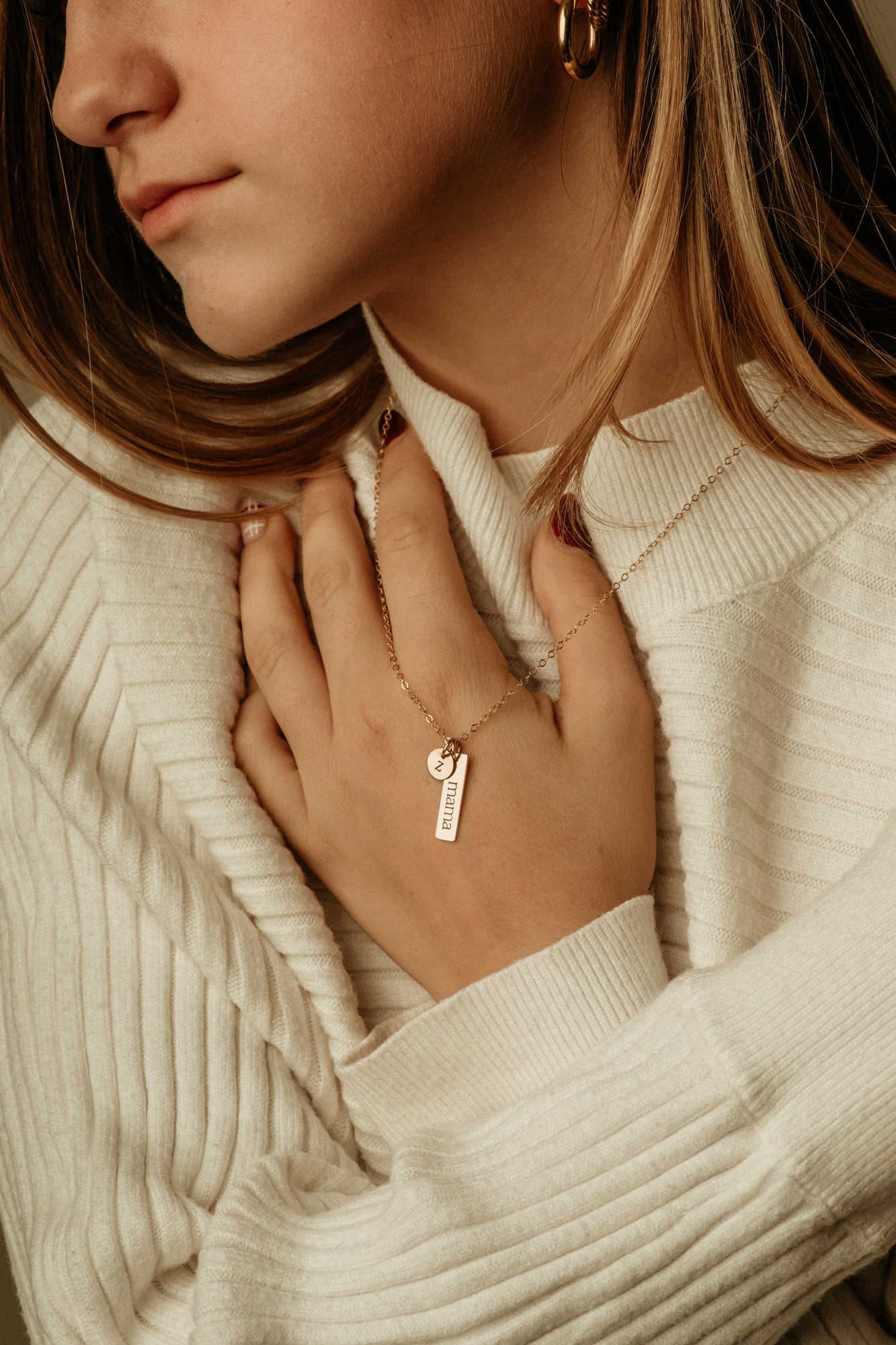 This dainty necklace pairs a slim rectangle tag with a tiny circle charm, creating a sweet, layered look you can personalize. The rectangular pendant offers space for a name, date or word, while the mini circle charm is perfect for an initial or symbol. Both charms come in your choice of gold or silver, giving you an everyday piece that feels personal, soft, and easy to layer.