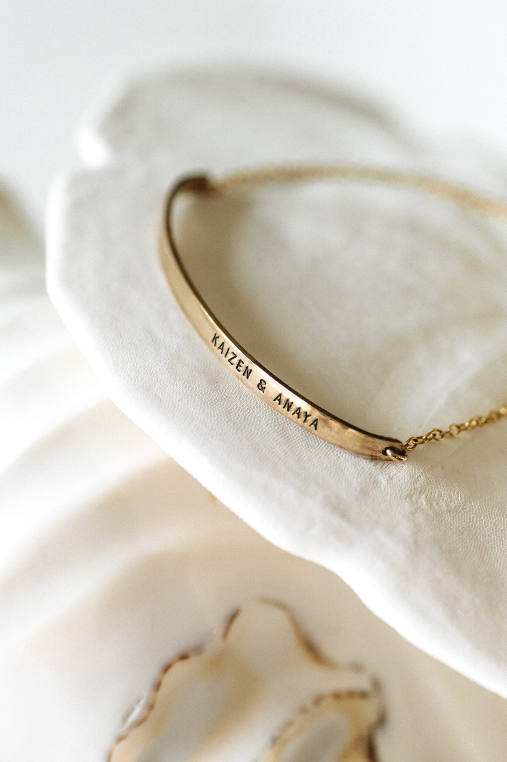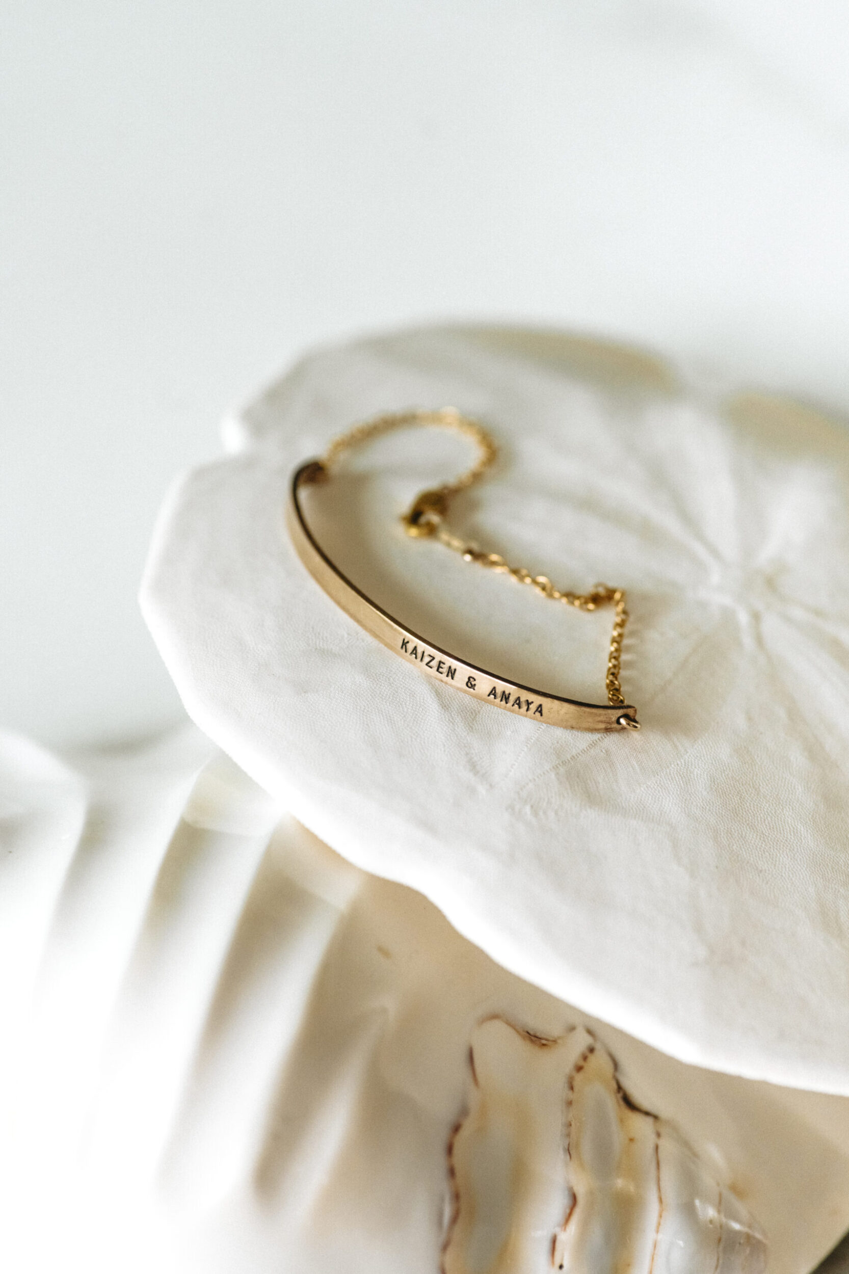 The Pulse Bracelet features a sleek gold-filled bar, engravable on both sides, anchored by a delicate adjustable chain that moves with you—simple, modern, and personal.